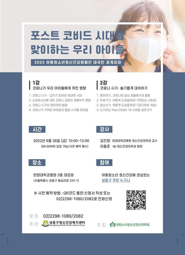 [시민일보 = 홍덕표 기자] 서울 성동구 정신건강복지센터가 대한소아청소년정신의학회와 함께 오는 28일 '포스트 코비드 시대를 맞이하는 우리 아이들'을 주제로 대국민 공개강좌를 운영한다.