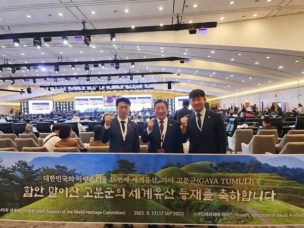 | ▲ 왼쪽부터_백인수 주무관_조근제 함안군수_조신규 문화유산관광담당관함안 말이산 고분군 세계유산 등재 확정사진 |