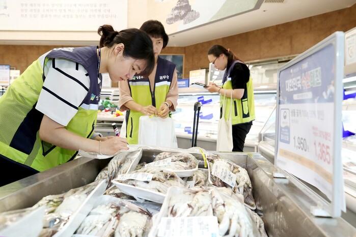 | ▲ 성동구가 추석을 앞두고 성수식품 제조·판매업소 점검을 마쳤다. 사진은 대형마트에서 검사 의뢰 식품을 수거하고 있는 성동구보건소 관계자 모습 (사진=성동구청 제공) |