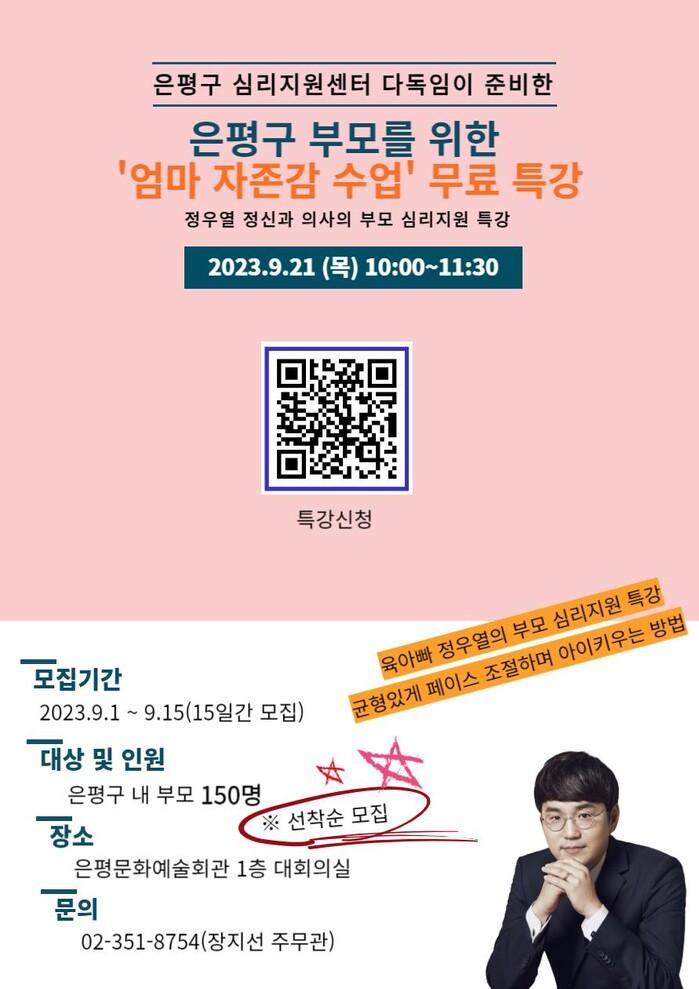 [시민일보 = 이대우 기자] 서울 은평구(김미경 구청장)가 오는 9월1~15일 은평구 부모를 위해 마련한 무료 특강으로 ‘엄마 자존감 수업’ 참석자를 신청받는다고 밝혔다.