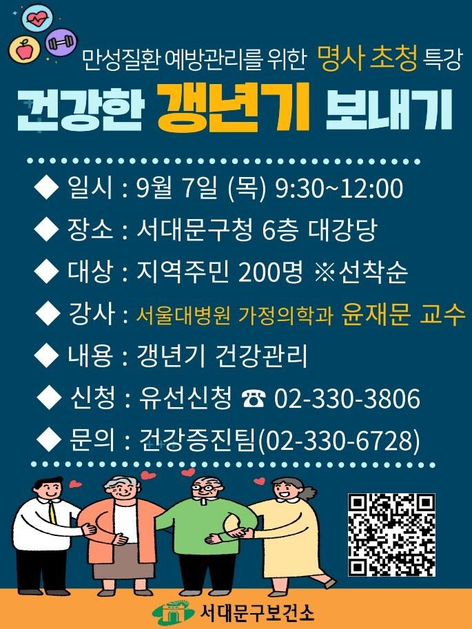 [시민일보 = 홍덕표 기자] 서울 서대문구(구청장 이성헌)가 중장년층의 슬기로운 갱년기 극복과 건강한 생활 습관 형성을 위해 오는 9월7일 오전 9시30분부터 낮 12시까지 구청 6층 대강당에서 ‘건강한 갱년기 보내기’ 특강을 연다.
