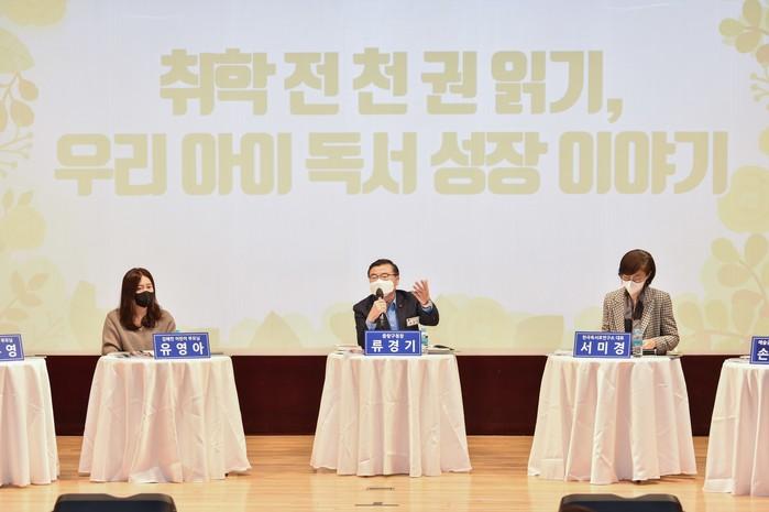 서울 중랑구는 지난 22일 ‘취학 전 천 권 읽기, 우리 아이 독서 성장 이야기’ 세미나를 개최했다. 세미나에는 취학 전 1000권 읽기 달성 아동 학부모들이 참석해 아이 및 가족들의 변화를 얘기해보고 전문가들과 개선방향에 대해 이야기를 나눴다. 사진은 세미나에서 류경기 구청장(가운데)이 발언하고 있는 모습. (사진제공=중랑구청)