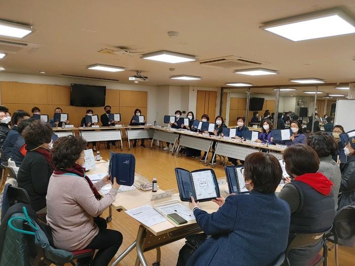 서울 송파구 마천1동은 주민 돌봄 자원봉사자를 지원하고 복지사각지대 발굴 역량을 강화하기 위한 ‘복지동행 활동수첩’을 최근 발간했다. 수첩에는 복지 현장 위기대응 매뉴얼 등 주민 봉사자들에게 꼭 필요한 내용이 담겨 있다. 사진은 복지동행 돌봄수첩을 받은 주민 봉사자들의 모습. (사진제공=송파구청)