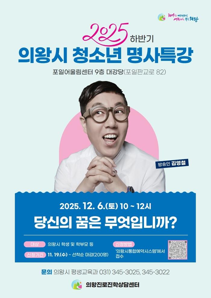 [의왕=송윤근 기자] 경기 의왕시 진로진학상담센터는 지역내 학생 및 학부모 등 200여명을 대상으로 오는 12월6일 의왕시 포일어울림센터 9층 대강당에서 ‘2025 하반기 의왕시 청소년 명사 특강’을 개최한다고 밝혔다.