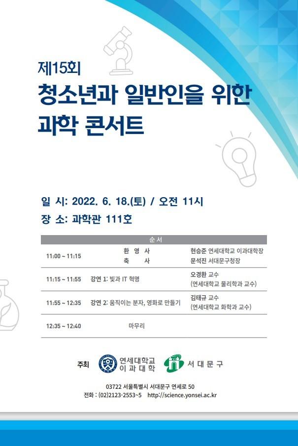 [시민일보 = 홍덕표 기자] 서울 서대문구(구청장 문석진)가 연세대학교 이과대학과 함께 오는 18일 오전 11시부터 100분 동안 연세대 과학관 111호에서 '제15회 청소년과 일반인을 위한 과학콘서트'를 개최한다.
