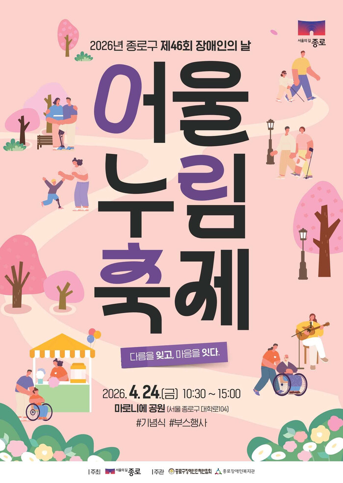 [시민일보 = 이대우 기자] 서울 종로구(구청장 정문헌)가 24일 오전 10시30분~오후 3시 마로니에 공원에서 ‘2026년 종로구 어울누림 축제’를 개최한다.