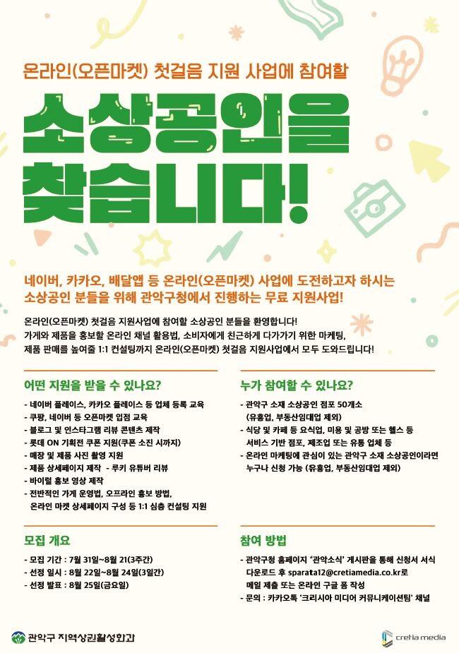 [시민일보 = 여영준 기자] 관악구(구청장 박준희)는 소상공인의 온라인 시장 진입과 신규 판로개척을 돕는 ‘온라인(오픈마켓) 첫걸음 지원 사업’의 참여 점포를 오는 21일까지 모집한다고 밝혔다.