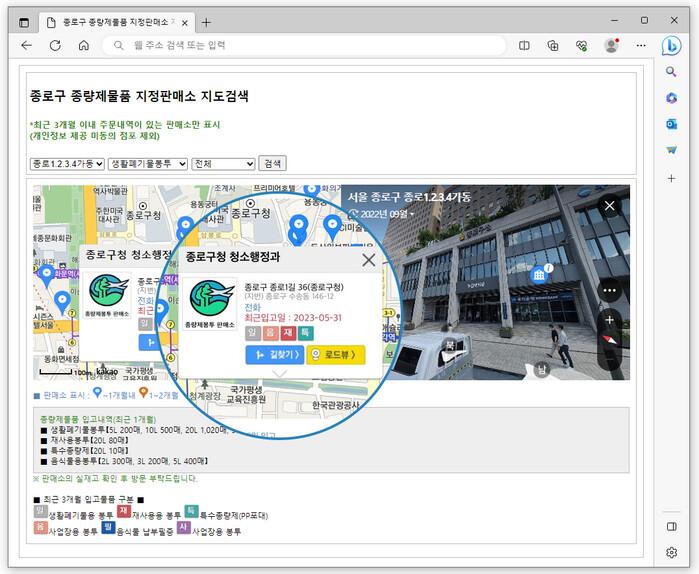 본 서비스는 구청 누리집에서 집 가까운 종량제봉투 판매소를 지도로 검색하고 최근 봉투 입고 내역(리터별, 종류별)을 실시간 확인할 수 있다는 점에서 눈길을 끈다.