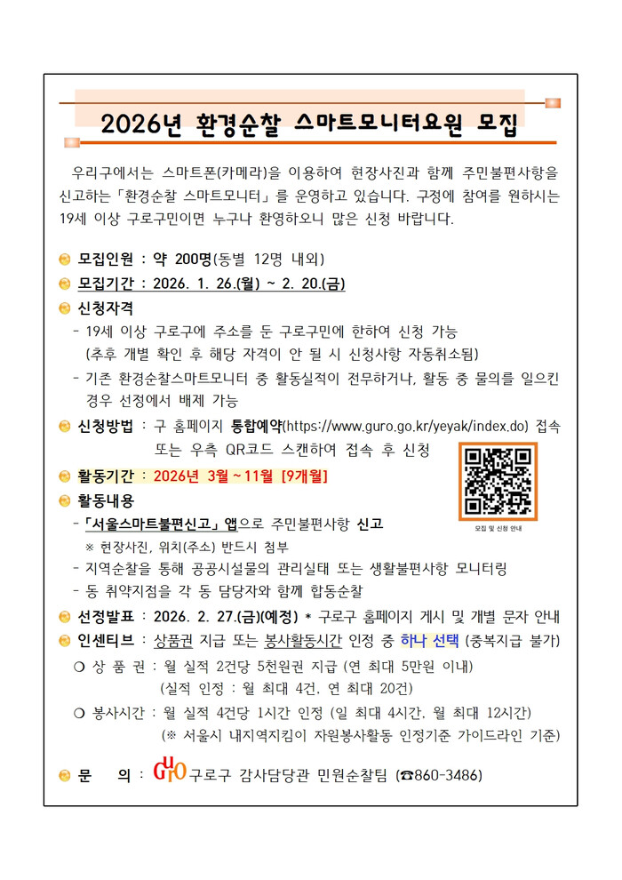 | ▲ 2026년 환경순찰 스마트모니터요원 모집 안내문. (사진=구로구청 제공) |