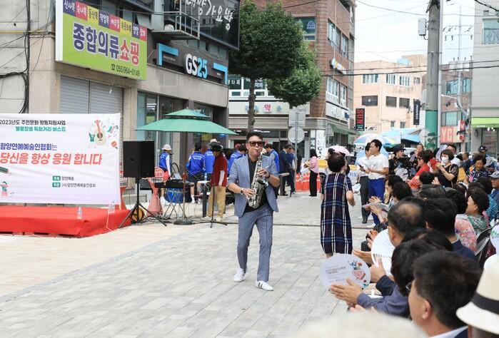 지역 가수와 군민들이 음악공연을 통해 문화적 소통을 나누고 장날 공연을 통해 전통시장의 활성화를 위해 개최된 이번 버스킹 공연은 문체부 공모사업인 지역문화 활력촉진 지원사업 중 주민문화활동지원사업으로 추진됐다.