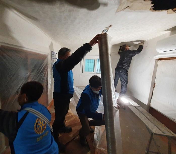 경기 의정부시 호원2동은 최근 의정부중앙로타리클럽의 지원으로 천장이 내려앉는 등 위험한 환경에 놓인 지역내 복지사각지대 홀몸노인 가구에 대한 주거환경개선사업을 추진했다. 사진은 이날 봉사자들이 천장을 보수하고 있는 모습. (사진제공=의정부시청)
