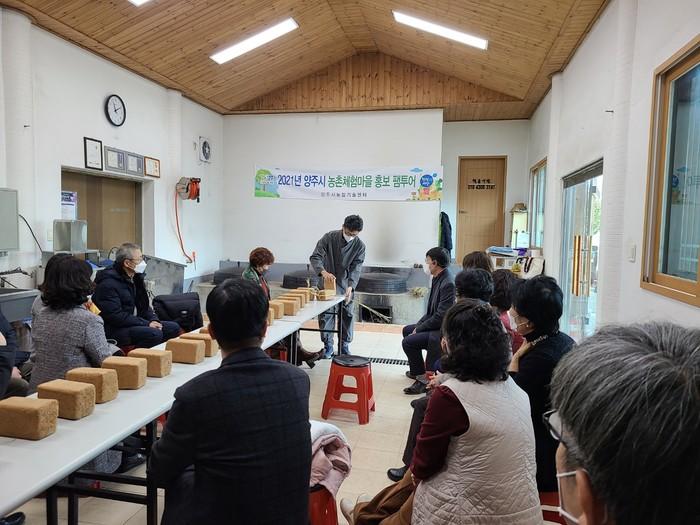 경기 양주시는 최근 총 3회에 걸쳐 지역내 초등학교 교원 123명을 대상으로 ‘양주시 농촌체험마을 팸투어’를 진행했다. 참석자들은 남면 맹골마을 등 지역내 농촌체험마을 찾아 마을별 특성을 살린 연잎밥 만들기, 장 담그기 등 다채로운 프로그램을 체험했다. 사진은 장 담그기 교육이 진행되고 있는 모습. (사진제공=양주시청)
