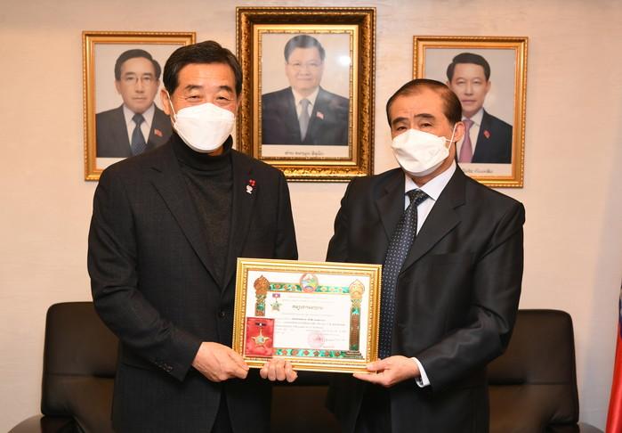 경기 안산시는 9일 라오스 비엔티안특별시에 한국어교육원 전용 기숙사를 건립한 공로를 인정받아 라오스로부터 국무총리 노동훈장을 받았다. 사진은 주한 라오스 대사관에서 윤화섭 시장(왼쪽)과 티엥 부파 대사가 기념촬영을 하는 모습. (사진제공=안산시청)