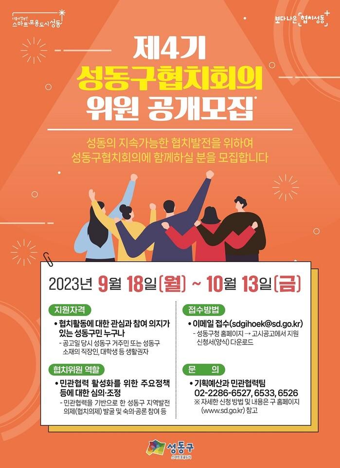 [시민일보 = 홍덕표 기자] 서울 성동구(구청장 정원오)가 오는 10월13일까지 총 26일간 지속가능한 민관협치 정책의 비전을 제시하고 함께 실현해 나갈 제4기 성동구협치회의 민간위원을 공개모집한다.