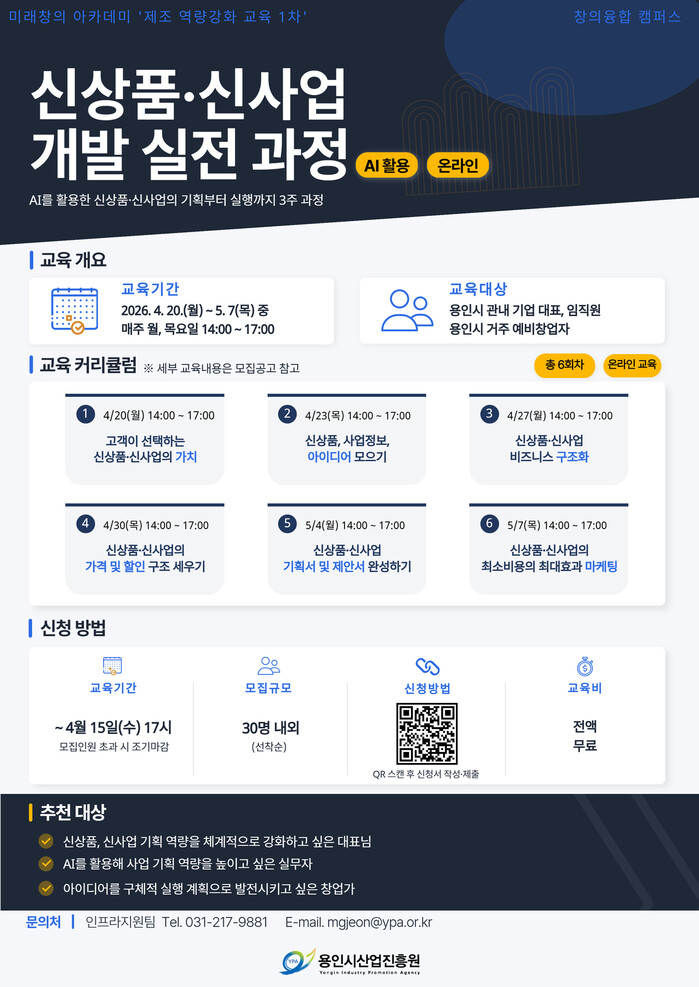 [용인=오왕석 기자] 용인시산업진흥원(이사장 이상일, 이하 진흥원)은 관내 기업 및 예비창업자의 제조 역량 강화를 위한 「신상품‧신사업 개발 실전 과정(AI 활용)」 교육생을 모집한다고 밝혔다.