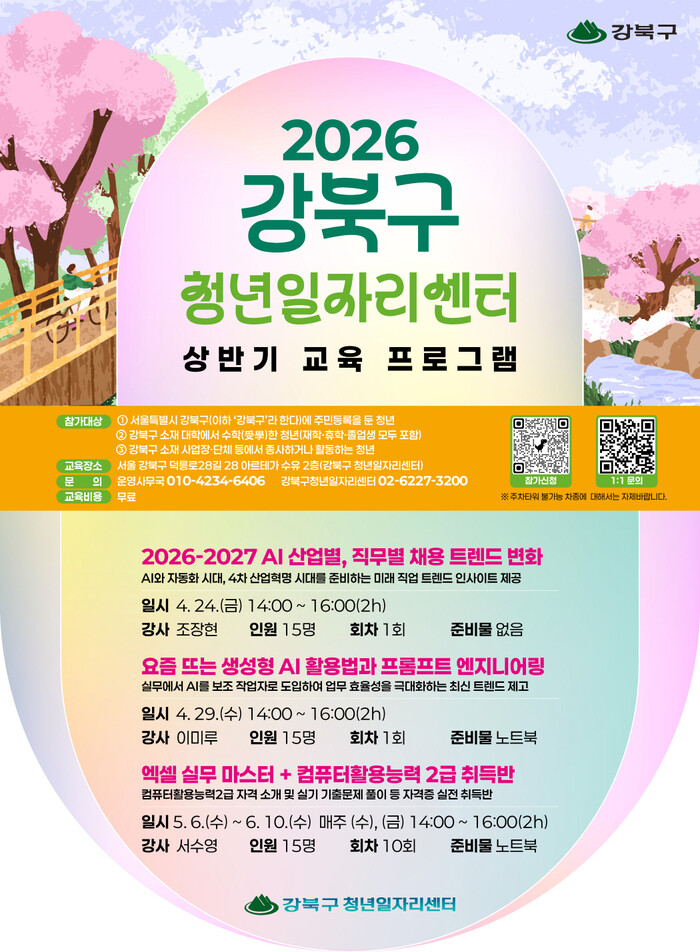 신청은 포스터에 안내된 큐알코드를 통해 가능하며, 교육 과정 및 일정 등 자세한 사항은 강북구 청년일자리센터로 문의하거나 강북구청 홈페이지을 참고하면 된다.