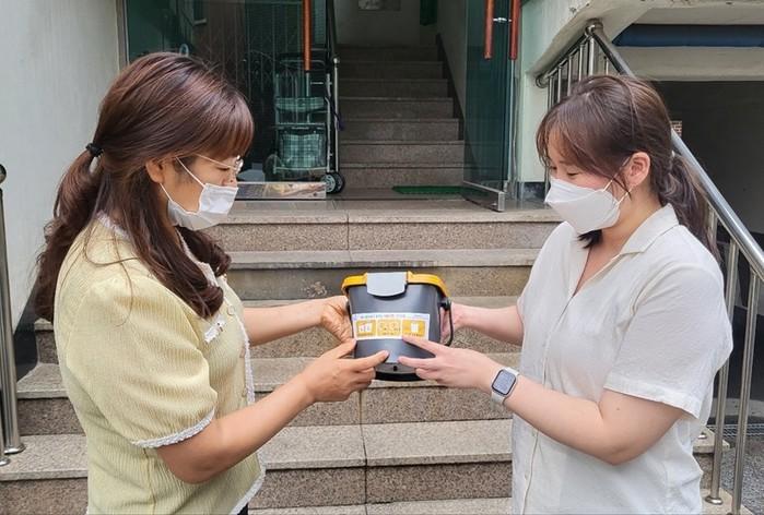 | ▲ 구 관계자가 음식물 쓰레기 배출 에티켓 관련 스티커를 지역 주민에게 배부하고 있다. (사진제공=노원구청) |