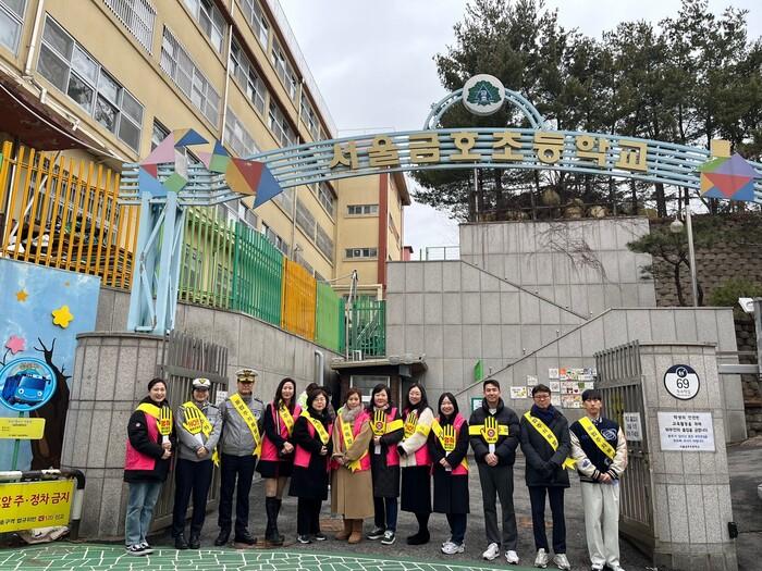 | ▲ 금호초등학교 정문 앞 교통안전 합동 캠페인에 참여한 관계자들이 기념 촬영을 하고 있다. (사진=성동구청 제공) |