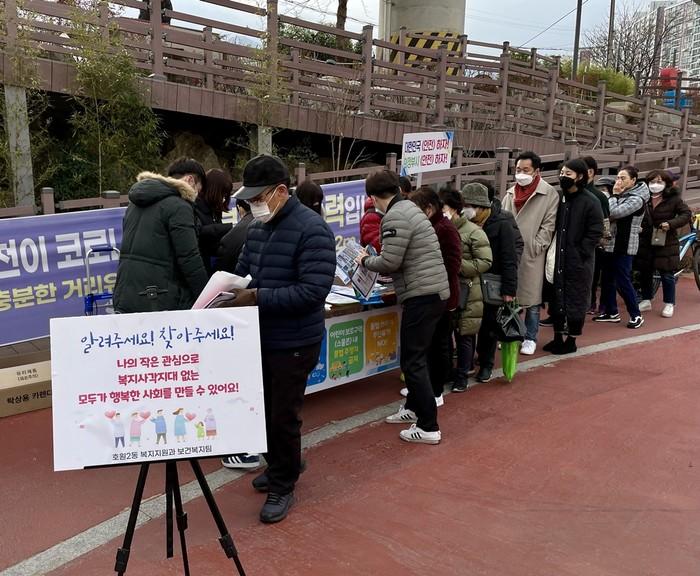 경기 의정부시 호원2동행정복지센터가 최근 회룡천 일원에서 겨울철 복지사각지대 위기가구 집중 발굴·지원을 위한 홍보 캠페인을 전개했다. 사진은 이날 캠페인에서 시민들에게 홍보물품과 함께 복지사각지대 안내문을 배부하고 있는 모습. (사진제공=의정부시청)