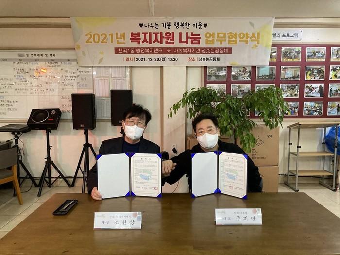 경기 의정부시 신곡1동이 지난 20일 샘솟는공동체, 돈까스클럽 용현점과 복지자원 나눔 업무협약을 체결했다. 이날 협약에 따라 샘솟는공동체는 결식 취약계층에 건강한 반찬 및 생필품 지원을, 돈까스클럽은 저소득 취약가구의 외식문화 장려 및 복지사업에 협력하기로 약속했다. 사진은 협약식에서 관계자들이 기념촬영을 하는 모습. (사진제공=의정부시청)