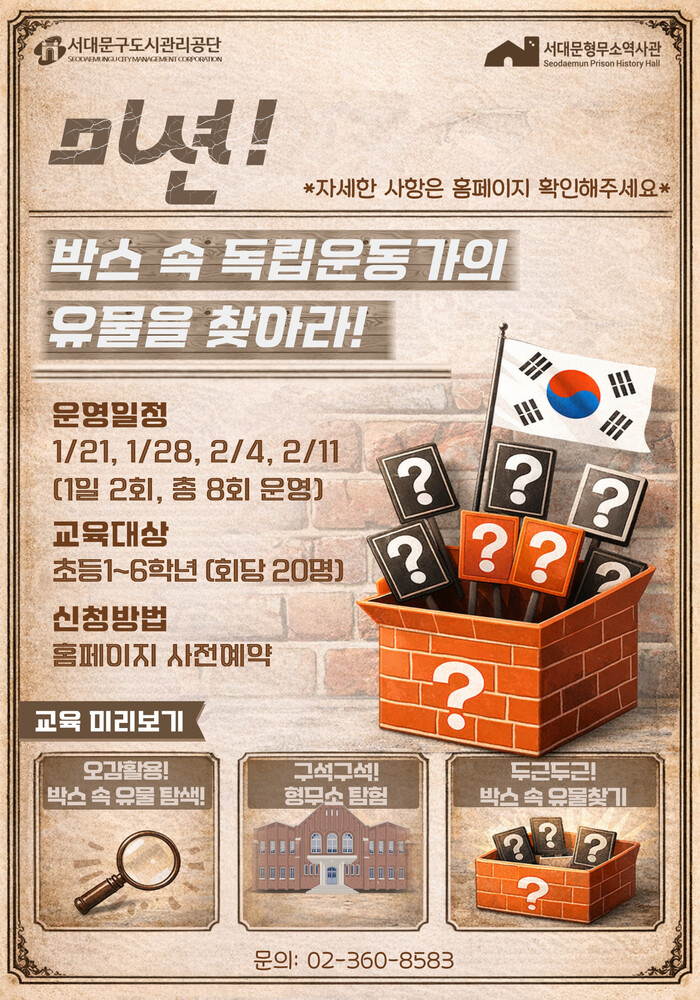 [시민일보 = 이대우 기자] 서대문구도시관리공단(이사장 한운영)이 운영하는 서대문형무소역사관은 겨울방학을 맞아 어린이·가족 관람객을 위한 다양한 프로그램을 진행한다.