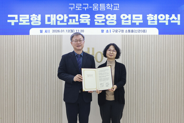 구로구가 12일 구청 소통홀에서 움틈학교와 ‘구로형 대안교육 운영’에 관한 업무협약을 체결하고, 이주배경 청소년을 위한 대안교육 지원 사업을 본격 추진한다. 이번 협약은 언어와 문화적 차이로 학업에 어려움을 겪는 청소년에게 안정적인 학습 기회를 제공하고 사회 적응을 돕기 위해 마련됐다. 사진은 장인홍 구청장(왼쪽)이 협약서를 들고 기념 촬영을 하는 모습. (사진=구로구청 제공)