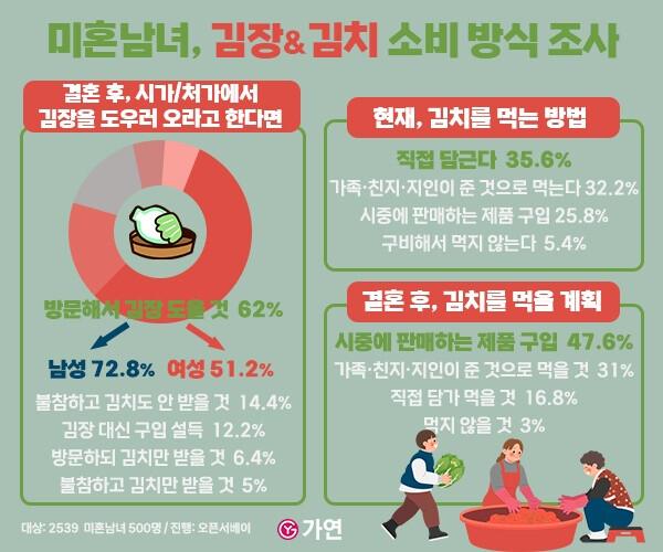 결혼정보회사 가연이 올 초 ‘2025 결혼 인식 조사’를 통해, ‘김장과 김치 소비 방식’에 대한 미혼남녀의 생각을 알아봤다. (2539남녀 500명, 오픈서베이 진행, 신뢰수준 95%, 표본오차 ±4.38%P)