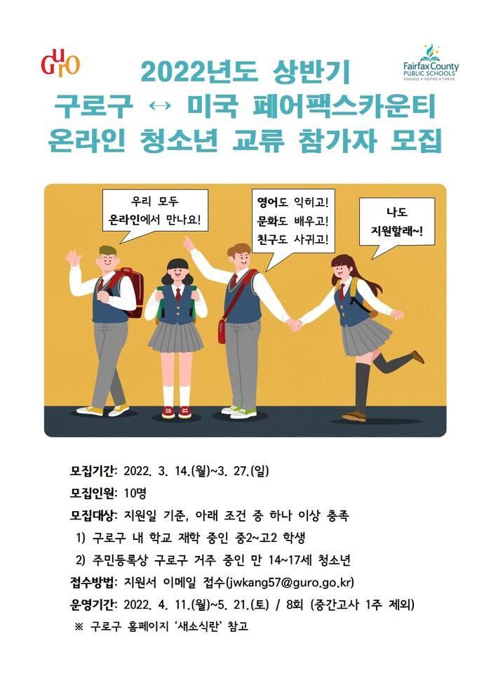 [시민일보 = 박준우 기자] 서울 구로구(구청장 이성)가 미국 페어팩스카운티 온라인 청소년 교류 참여자를 모집한다.