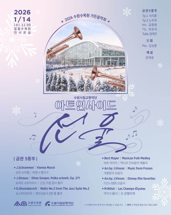 수원시립교향악단 금관 5중주가 출연해 요한 슈라멜의 ‘비엔나 행진곡’ 등 총 7곡을 연주한다.