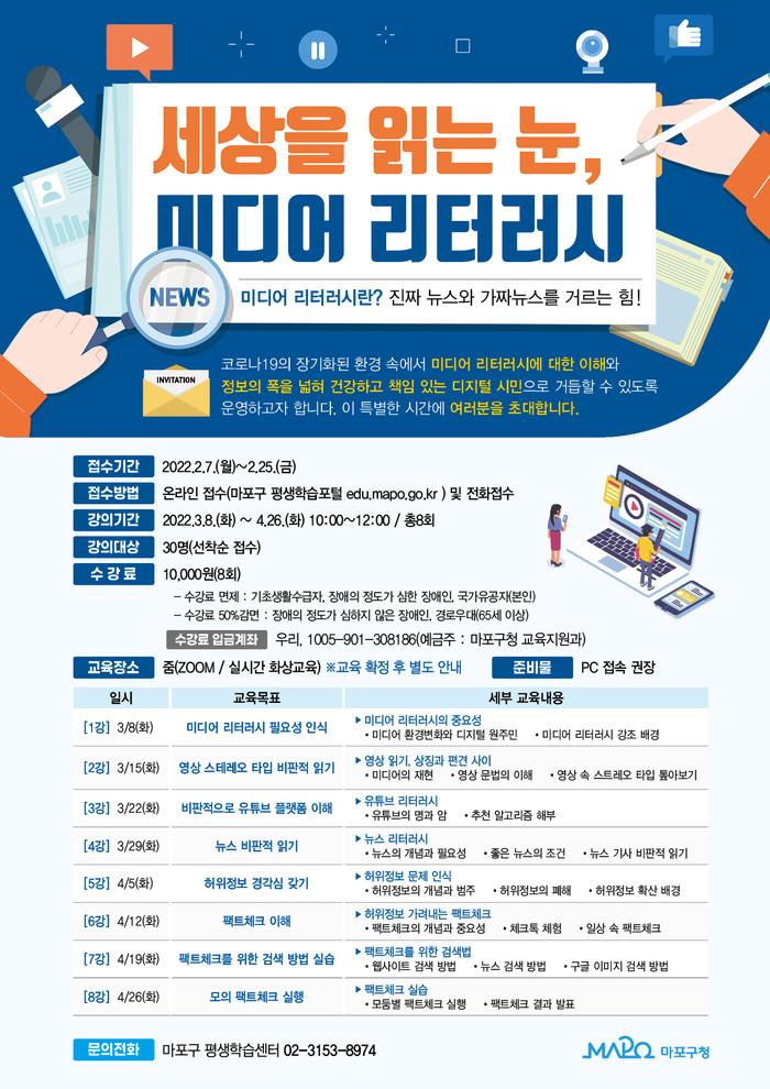 [시민일보 = 홍덕표 기자] 서울 마포구(구청장 유동균)가 2022년 상반기 마포대학 특강 '세상을 읽는 눈, 미디어 리터러시' 수강생 30명을 오는 25일까지 선착순 모집한다.