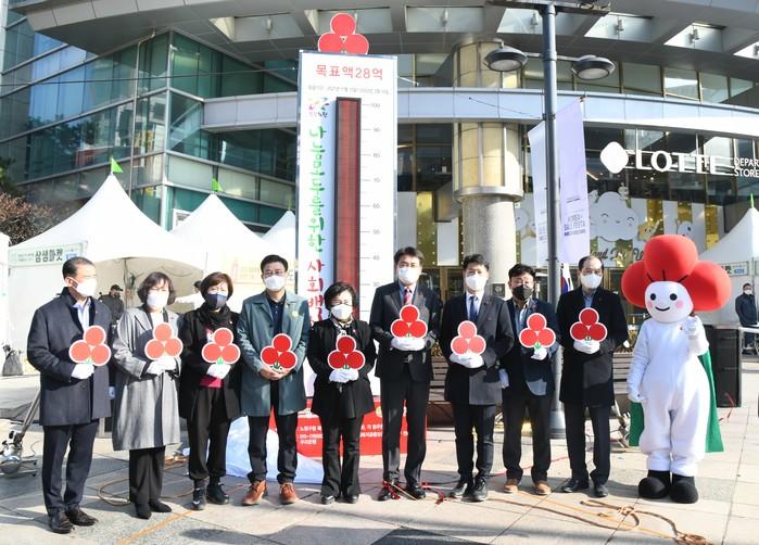 오승록 서울 노원구청장은 15일 사랑의 온도탑 제막식에 참석했다. 사랑의 온도탑은 가로 1.5m·세로 4.65m로 오는 2022년 2월14일까지 운영한다. 2022년 노원구 따뜻한 겨울나기 사업 목표액은 전년대비 2% 증가한 28억원이다. 사진은 이날 제막식에서 오 구청장(오른쪽 다섯 번째)이 관계자들과 기념촬영을 하는 모습. (사진제공=노원구청)