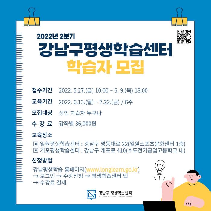 [시민일보 = 이대우 기자] 서울 강남구가 오는 6월 개강하는 ‘2022년 2분기 강남구 평생학습센터 프로그램’에 참여할 성인 학습자를 27일~6월9일 ‘강남평생학습’ 홈페이지를 통해 모집한다.