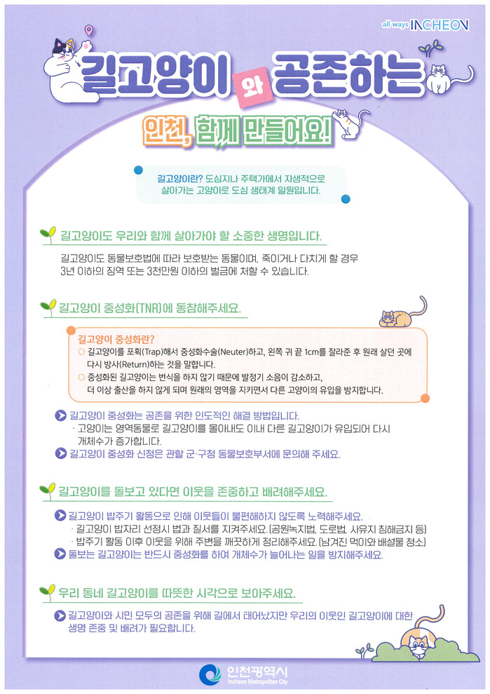 구 관계자는 “길고양이 중성화 지원사업을 통해 주민 생활 불편을 줄이고 인도적인 방식으로 길고양이 개체 수를 조절해 동물복지를 실현할 것”이라며 “앞으로도 사람과 동물이 함께 공존하는 행복한 계양구를 만들기 위해 노력하겠다.”라고 말했다.
