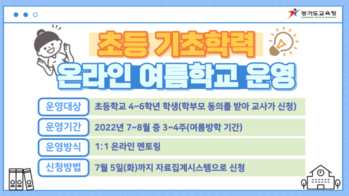 송호현 학교교육과정과장은 “이번 온라인 여름학교에 참여하는 학생을 응원하며, 기초학력 향상을 위해 노력하는 선생님들께 감사하다”면서 “앞으로도 누구나 보장받아야 하는 기초학력을 위해 촘촘한 학습 안전망 구축에 최선을 다하겠다”고 말했다.