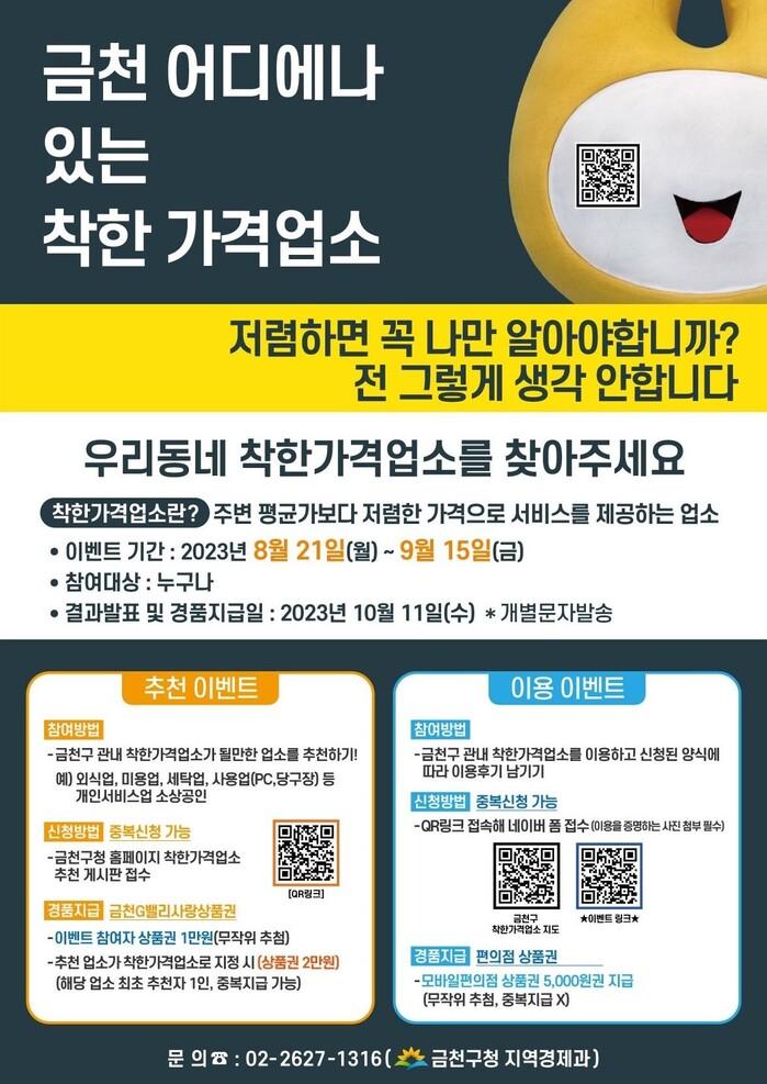 구는 추첨을 통해 ‘신규 업소 추천’에 참여한 자에게는 금천 G밸리사랑상품권을, ‘착한가격업소 이용’에 참여한 자에게는 편의점 상품권을 증정할 예정이다.