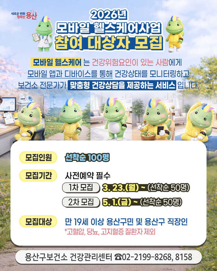 이와 함께 용산구 보건소는 매주 건강정보 콘텐츠를 발송하고, 월 1회 건강실천 리포트도 제공한다. 또한 무료 건강검진과 대면상담도 진행한다.