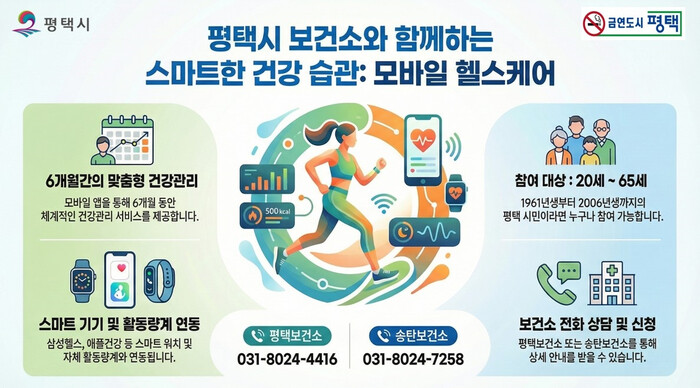 [평택=오왕석 기자] 평택시(시장 정장선)가 시민들의 만성질환 예방과 건강한 생활 습관 형성을 돕기 위해 ‘2026년 보건소 모바일 헬스케어’ 사업을 시작하고 참여자를 선착순 모집하고 있다.