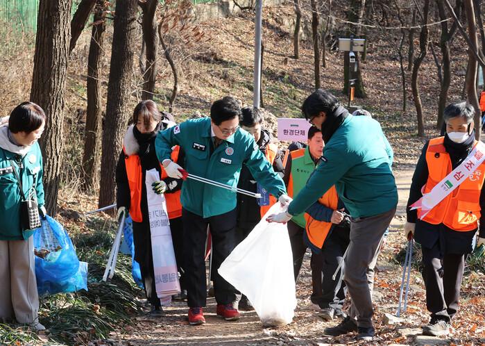 박일하 서울 동작구청장이 최근 사당동 서달산 정상 해맞이광장에서 열린 ‘서달산 겨울맞이 환경정비’ 행사에 참석했다. 사진은 박 구청장이 지역주민들과 함께 쓰레기와 낙엽을 치우며 산불 예방 캠페인을 벌이고 있는 모습. (사진=동작구청 제공)