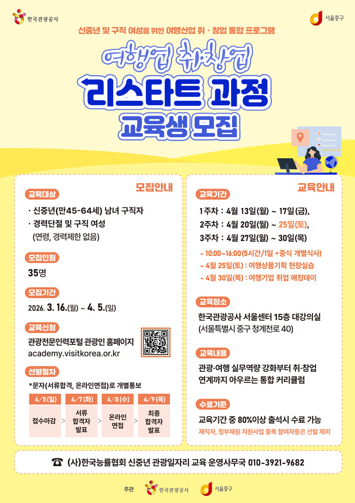 [시민일보 = 여영준 기자] 중구가 한국관광공사와 함께 관광업계 구인난 해소와 지역 기반 일자리 창출을 목표로 '여행업 취·창업 리스타트 과정'을 오는 4월13일부터 운영한다.