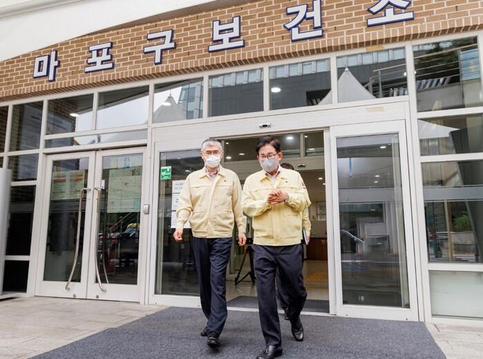 | ▲ 박강수 마포구청장이 시설 점검 차 마포구보건소에 방문했다(오른쪽) (사진=마포구청 제공) |