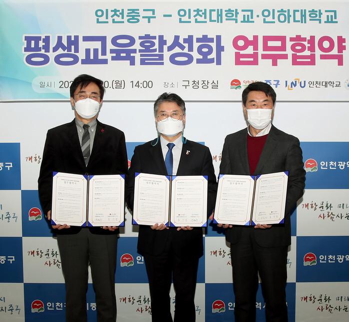[인천=문찬식 기자] 인천 중구는 최근 제1청 구청장실에서 인천대학교, 인하대학교와 구민의 평생학습문화 조성을 위한 '평생교육활성화 '업무협약을 체결했다고 22일 밝혔다.