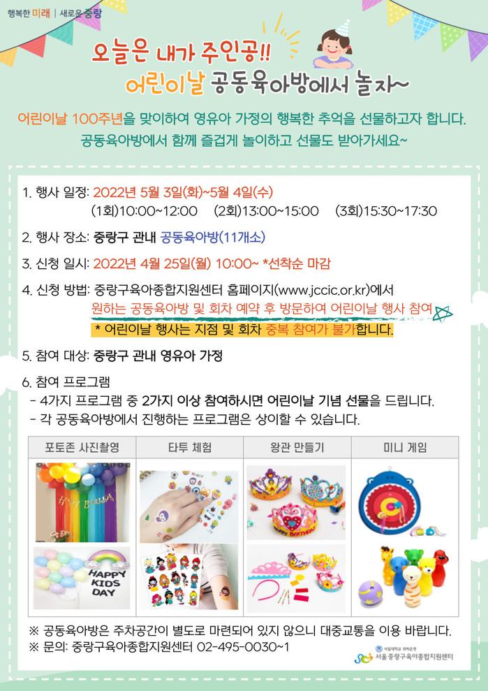 [시민일보 = 여영준 기자] 서울 중랑구가 어린이날 100주년을 맞아 3~4일 양일간 영유아들에게 특별한 추억이 될 기념행사를 개최한다.
