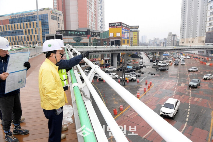 | ▲ 고광완 광주광역시 행정부시장이 설 명절을 앞둔 10일 오전 남구 백운동 도시철도2호선 1단계 4공구 211정거장 건설현장을 방문해 관계자로부터 공사진행상황을 보고 받은 후 건설현장 안전점검을 하고 있다. /광주광역시 제공 |