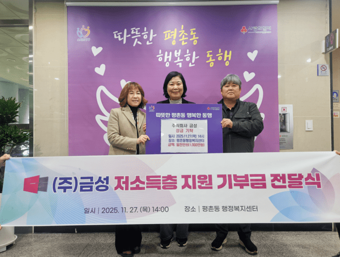 강윤덕 평촌동장은“이웃돕기 성금을 기탁해주신 ㈜금성에 감사드리며, 기탁된 성금은 ㈜금성 모든 임직원들의 소중한 마음을 담아 관내 어려운 이웃들이 따뜻하고 행복한 연말연시를 지내실 수 있도록 잘 전달하겠다”고 말했다.