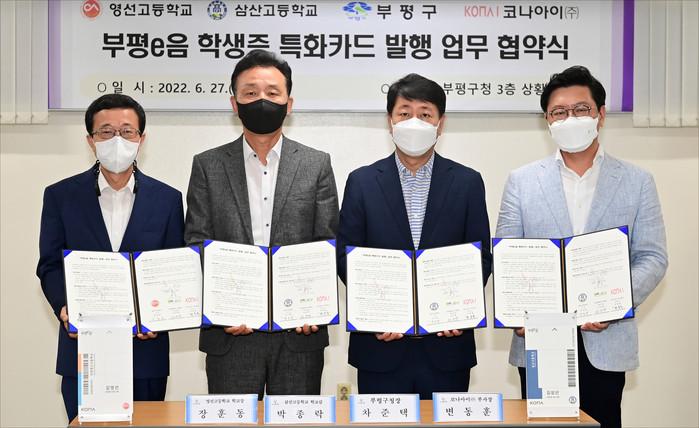 [인천=문찬식 기자] 인천 부평구가 27일 구청 상황실에서 영선고등학교, 삼산고등학교, 코나아이와 부평e음 학생증 특화카드 발행을 위한 업무협약을 체결했다.