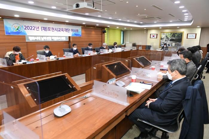 경기 포천시 교육재단이 최근 포천시청 2층 시정회의실에서 2022년도 제1차 이사회를 개최했다. 이날 이사회에서는 2021년 사업결산과 올해 장학사업 및 교육사업 계획 등에 대한 회의가 진행됐다. 사진은 이날 재단 이사회 관계자들이 회의를 진행하고 있는 모습. (사진제공=포천시청)