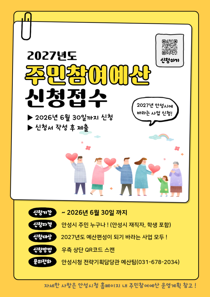 [안성=오왕석 기자] 안성시는 2027년도 예산 편성 과정에 주민의 다양한 의견을 반영하기 위해 오는 6월 30일까지 주민참여예산 제안사업 공모 접수를 실시한다고 밝혔다.