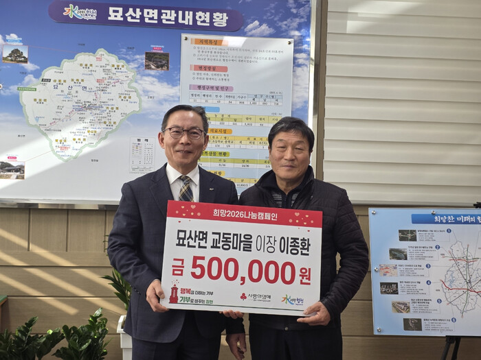 이에 이창기 묘산면장은 “어려운 이웃을 위해 따뜻한 나눔을 실천해 주셔서 감사드린다”며 “기탁된 성금은 도움이 꼭 필요한 가구에 소중히 전달하겠다”고 전했다.