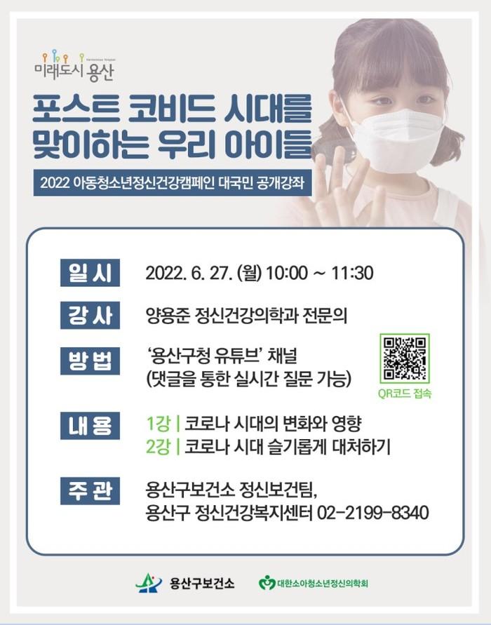 [시민일보 = 홍덕표 기자] 서울 용산구(구청장 성장현)가 오는 27일 '포스트 코비드 시대를 맞이하는 우리 아이들'을 주제로 '2022 아동청소년정신건강캠페인 대국민 공개강좌'를 개최한다.