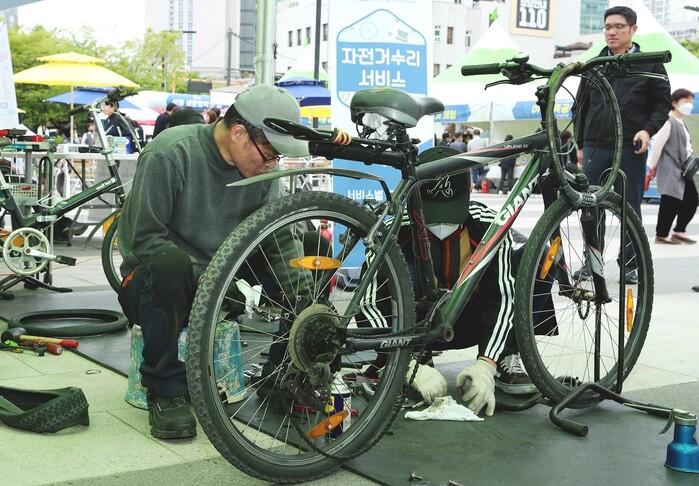 | ▲ 지난 성동구 생활밀착의 날 행사에서 자전거수리 서비스가 이뤄지고 있는 모습. (사진=성동구청 제공) |